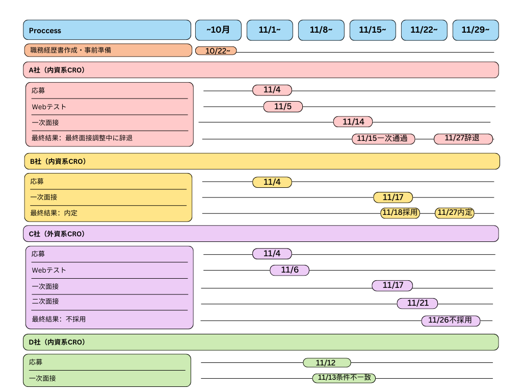 | 最終決定 | 内資系CROへ翌年4/1に入社 | 退職時期の都合に合わせ、入社時期も4月で調整してもらえた。 |